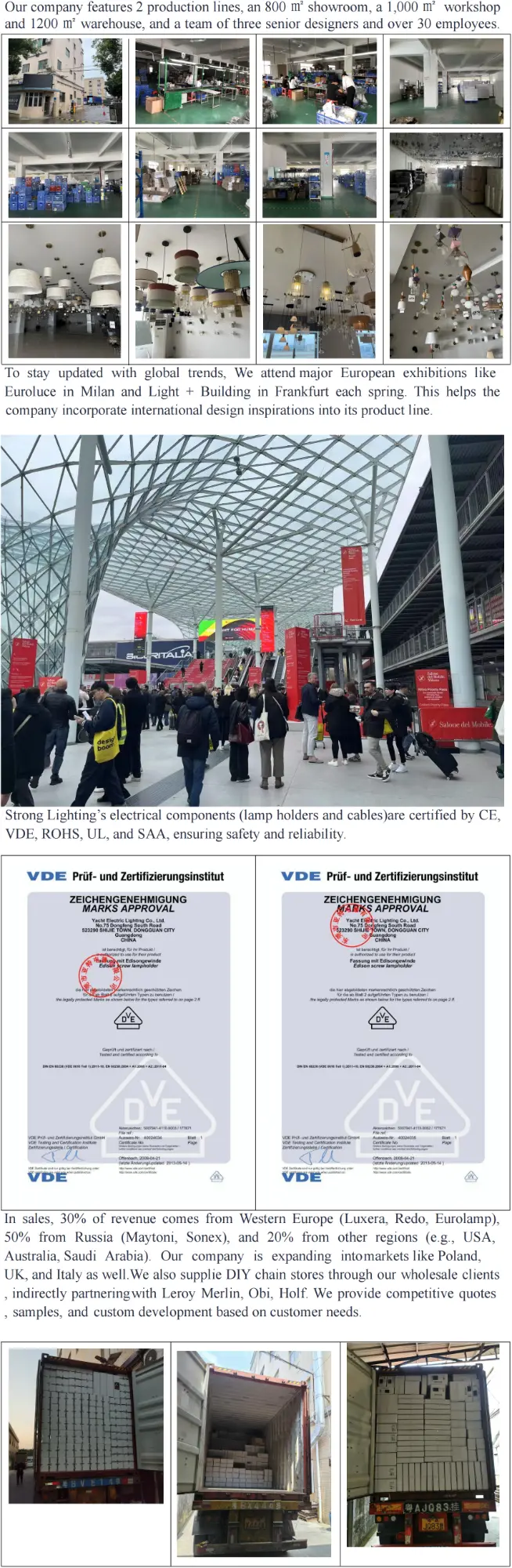 Abbiamo servito con orgoglio nomi globali come Leroy Merlin e OBI, costruendoci una reputazione per il design raffinato, la qualità durevole e la consegna puntuale. Dal 2015, Strong Lighting si dedica alla creazione di soluzioni di illuminazione che riflettono lo stile personale. La nostra gamma di oltre 3.000 prodotti spazia dal classico al contemporaneo, fondendo materiali come vetro, metallo e cristallo per creare pezzi innovativi e funzionali.